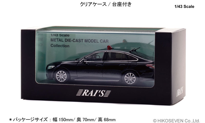Product specifications Painted finished product [Scale] 1/43 [Material] Die-cast (zinc alloy) [Others] Transparent case included Description Modeled a VIP guard vehicle from the 220 series Crown police car. The dignitary escort vehicle has similar specifications to the traffic undercover vehicle, and is based on an RS body and gasoline-powered vehicle. The reversible red light and the front red light in the grille are the same as the traffic mask, but the passenger side door mirror is a two-tiered one with an auxiliary mirror.