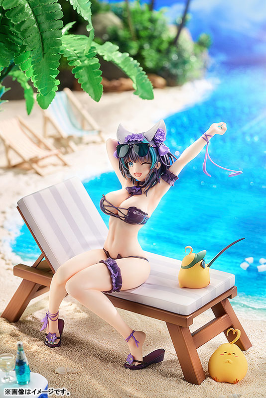 Figure body Dedicated pedestal Explanation Prototype production: RXCC Coloring: NIKU From “Azur Lane”, the heavy cruiser “Cheshire” belonging to Royal is now available in a swimsuit! The beautiful body that catches the eye and the refreshing deck chair that gives you a summer feel highlight Cheshire’s cuteness. The revealing swimsuit and innocent smile bring out the charm of the illustrations to the fullest. The sunscreen clothing worn around the waist is removable. Please enjoy your vacation with Cheshire.