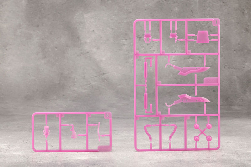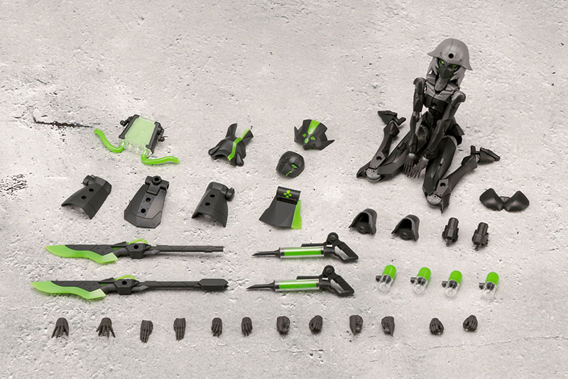 Comes with 2 colors of psychedelic accent color parts that contrast beautifully with black. You can assemble it in your favorite color. The included “Energy Seed” is molded in accent colors and colorless clear, and 4 sets can be assembled. Each part of the skirt part is composed of 3mm joints, and all 6 locations can be moved. The two swords “Scalpel” with a female motif can be used as a double edge mode by using connecting parts. The injector attached to the forearm hard point can be removed and used as a handheld weapon.