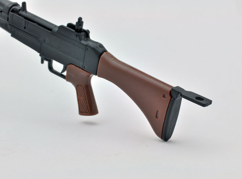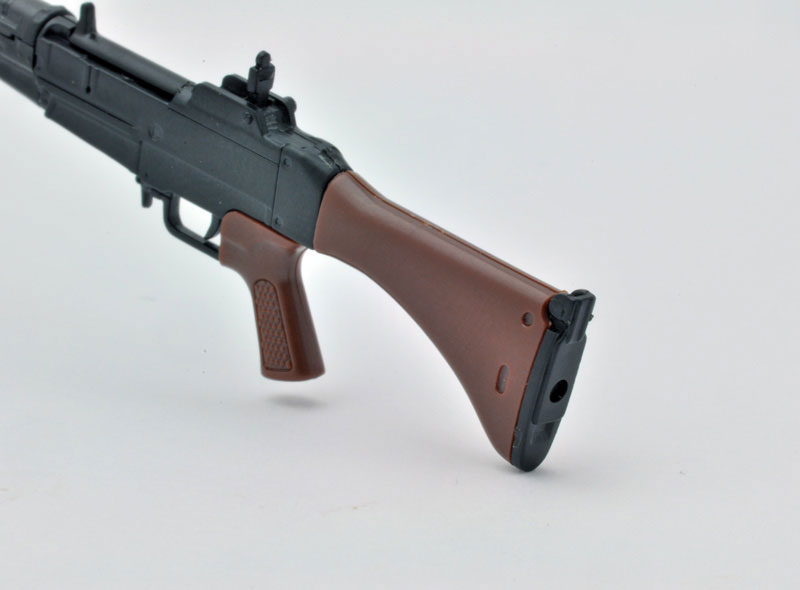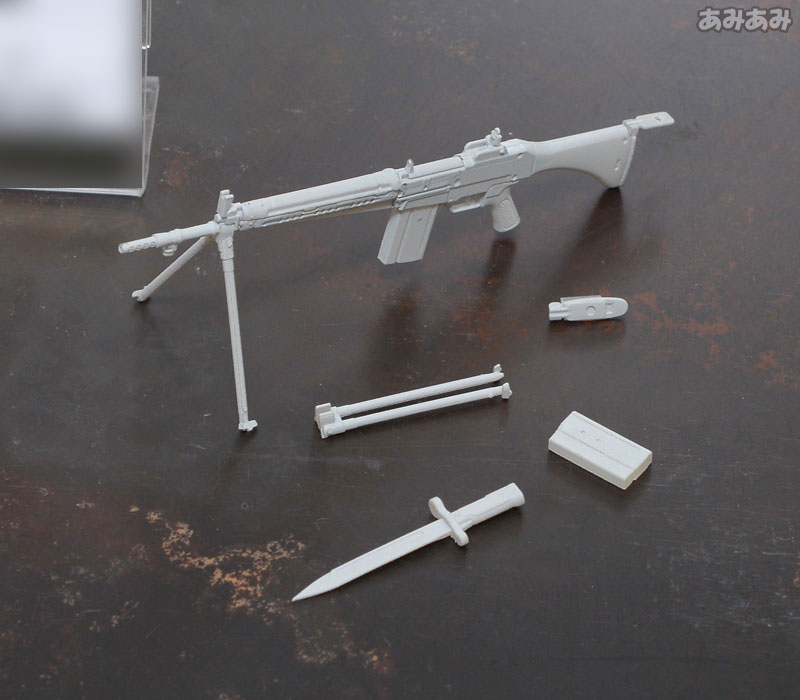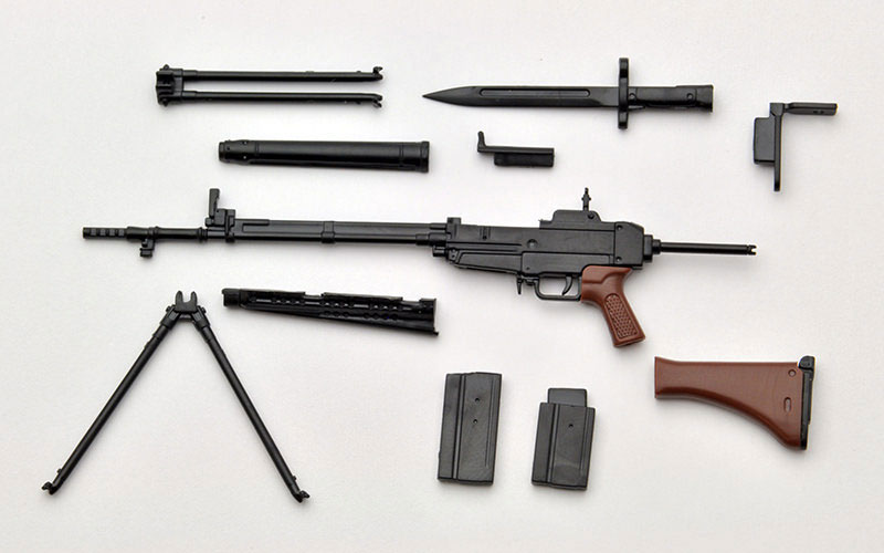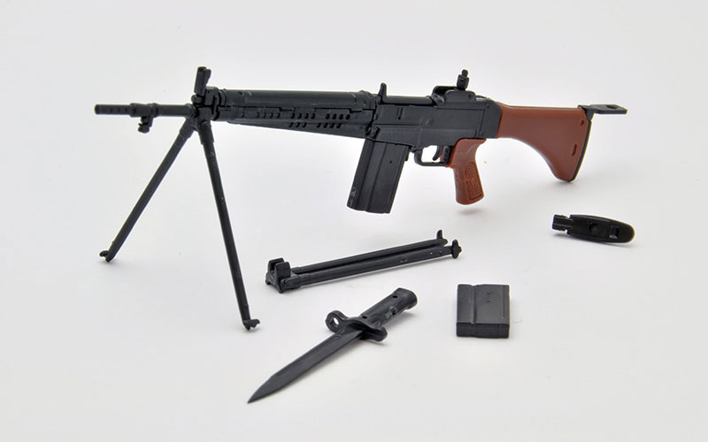 Made of PS, achromatic color *Use of adhesive for plastic models is recommended Commentary A domestically produced assault rifle that was first developed and designed in post-war Japan, and was officially adopted in 1964. It is a firearm with characteristics unique to Self-Defense Force firearms, such as high accuracy, a short stock that fits the physique of Japanese people, and a reduced bullet with the same shape as a 7.62mm NATO bullet but with a small amount of charge, making it easy to control. This kit comes with a bipod that can be opened or closed, a tail plate, a removable bayonet, and a full-sized magazine. Wooden parts such as the gun stock and grip, and other metal parts are reproduced using resin color coding.