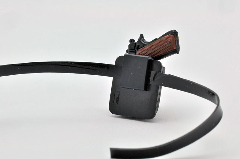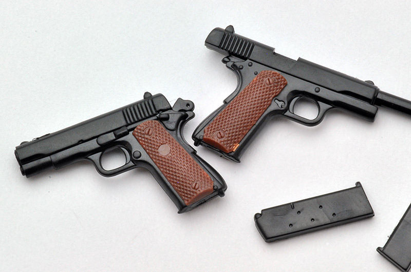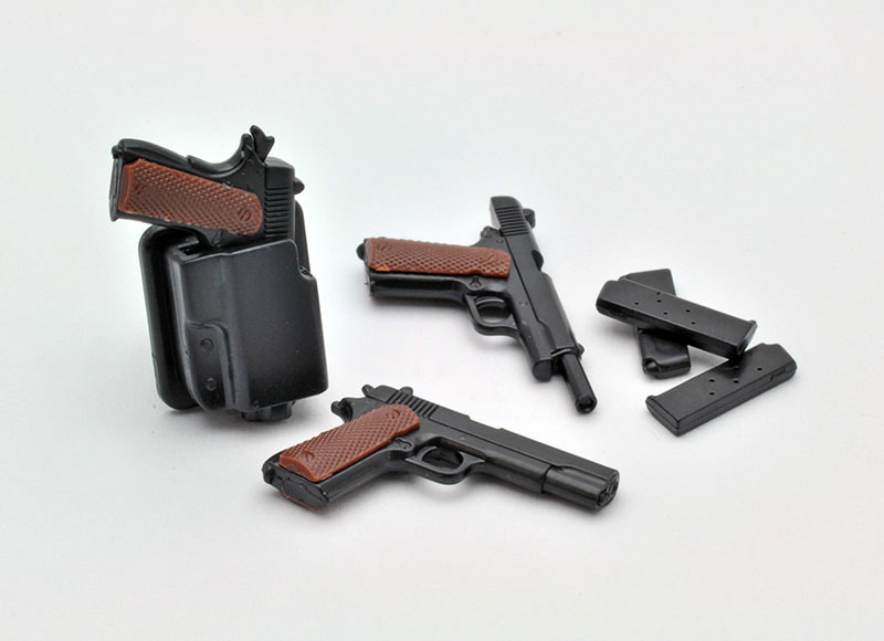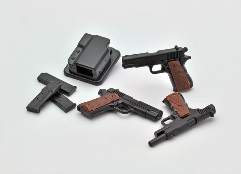 Made of PS, achromatic color *Use of adhesive for plastic models is recommended Commentary Even now, more than 100 years after the birth of the base model, this classic automatic handgun is popular for its simplicity and high stopping power. Modeling the M1911A1 type, which was used by the US military, the Self-Defense Forces, and the Japanese police, and its shortened combat commander type. Contains 3 forms: “lower hammer”, “raised hammer”, and “slide retreat”. The brown grip panel has also been reproduced as a separate part. As a bonus part, a special holster with a rubber belt is included.