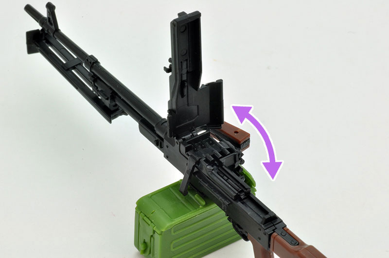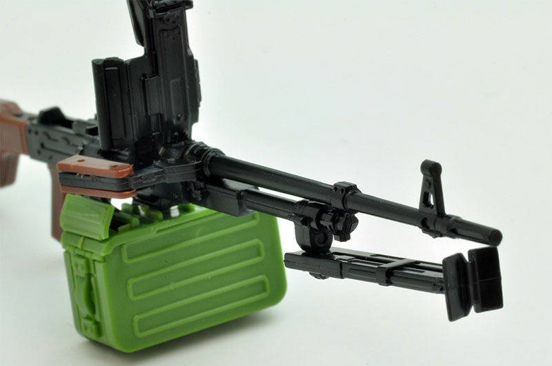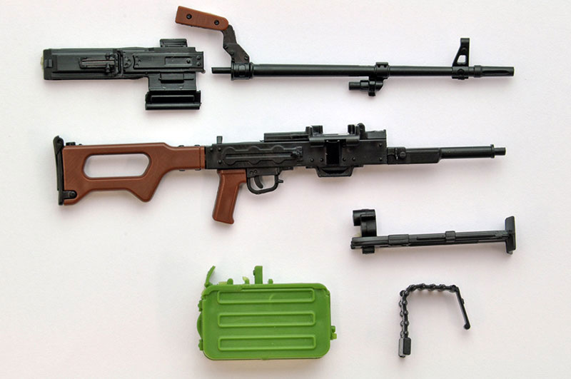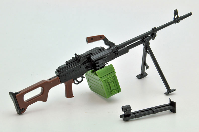 Black, green, brown Description 1/12 scale assembly kit “Little Armory” that combines realism with movable figures. The theme of this work is “guns of the former Soviet Union.” Please enjoy the unique ruggedness and charm that is different from Western designs. The PK (Primyot Kalashnikov-Kalashnikov machine gun), a general-purpose machine gun developed in the former Soviet Union that represents the East, and the improved PKM. Mosin Nagant, which is more powerful than the main rifle AK, uses 7.62mm x 54R bullets for Dragunov, fed by a non-separable link belt. It has been highly praised for its high reliability and maintainability due to its Kalashnikov design, as well as its extremely light weight compared to Western general-purpose machine guns of the same class. (PKM is 8.4kg while M240 is 12.5kg). This kit has two legs that can be opened or closed. Comes with a 100 round ammunition box and a belt link with a starter tab that reproduces the characteristic bullet feeding from the right side. The stock and ammunition box are different colors. *Using adhesive for plastic models is recommended.
