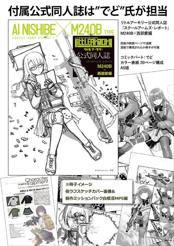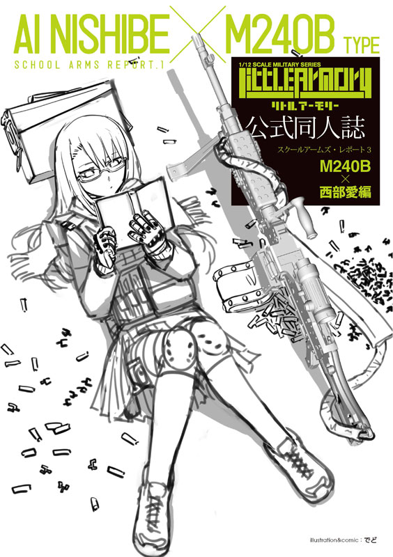Runner kit Glasses case Booklet Explanation A set of firearms kits, goods, and comic booklets! Recommended for beginners as it also helps you understand the shape of the gun with the themed manga, explanations, and models! In this work, we pick up the modern standard multi-purpose machine gun “M240” and the machine gunner JK “Ai Seibu”! ■M240B (ammunition included) The M240 is a Belgian-born multi-purpose machine gun that is loved by Seibu Ai. The B type is a US Army specification equipped with a hydraulic buffer and rail system. This product’s M240B type comes with a 50-round ammo pack that can be attached to the main body, as well as a belt link bullet made of soft resin! ■Glasses case for going out An illustration of Western love by Haruaki Fuyuno is printed on the eyeglass case. The affordable size makes it convenient for storing and carrying 1/12 scale figures, dolls, and accessories! Of course, it can also be used to store glasses. ■Official doujinshi School Arms Report 3 Contains newly drawn comics and commentary pages featuring the M240 machine gun and love of the West. Mr. Dedo is in charge of the comics. *Except for the runner kit, glasses case, and booklet are not included.