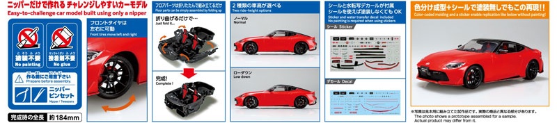 The RZ34 type Fairlady Z NISMO is now available in Aoshima’s new proposed series “Rakupla Snap Car”. For those who want to make a plastic model of a car but don’t want to make a mistake, there is no need for glue or painting. The number of parts is also reduced, significantly lowering the hurdles for plastic model production. Of course, you can also paint it in earnest and make it! ・Can be assembled without using adhesives ・Color-coded molding and stickers eliminate the need for painting Seals and water transfer decals included ・High reproducibility with few parts ・Two types of vehicle heights can be selected ・Steering can be turned *Please prepare a tool such as nippers to separate parts from the runner.