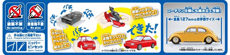 Product specifications Plastic model [Scale] 1/32 Commentary – Volkswagen’s “Beetle” whose production began in 1938 – Reproduces the model commonly known as “Oval” – Easy model with 32 parts [What is Rakupla Snap Kit] – No painting required By reproducing the body color with plastic material, painting is no longer necessary. The shiny body is also a highlight. ・No need for adhesives Adhesives are no longer required by using a snap-in type. ・High reproducibility with fewer parts Although the kit is simplified, high reproducibility is achieved in 1/32 scale. Body color: No.20-PY Postal Yellow