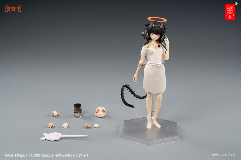 Figure body x 1 Fully movable face parts with eyeballs x 1 (smile, body attachment not included) Halo x 1 Specimen bottle x 1 Mecha tail x 1 Mini tool for changing gaze NEO x 1 Replacement hand parts x 3 sets (bottle holding, gripping, connecting) Clear pedestal x 1 Post x 1 Clip x 1 Post extension parts x 1 Description The original character “Three Monkeys” by illustrator “Zenmai Book” has been commercialized as an action figure! -One replacement face part is included separately from the main body. Since the three monkeys have the same appearance in the setting, the replacement face parts can also be attached to other characters of the three monkeys. The face parts of “Hear Zaru” have fully movable eyeballs, and the line of sight can be changed using the included “Mini Tool NEO for changing the line of sight”. -The eyes are made of fluorescent color, and the hair ornament and halo are made of fluorescent material, so they will glow when illuminated with a black light. ・3 sets of replacement hand parts are included in addition to the main body. (*The “connection” hand parts can be used when holding hands with other three monkey characters.) – The main body is wearing cloth clothes, and all details such as weathering, blood stains, and tags are reproduced in fine print. – Adopts the same pull-out hip joint as the same manufacturer’s action figure series “Bunny Girl Irin” (sold separately) to achieve a wide range of movement. Overseas products tend to have a higher chance of being delayed or canceled than domestic products, and due to differences in import distribution routes, the arrival time of the product may differ from that of other stores. In addition, if the packaging is damaged when it arrives at our store, we will not be able to replace it with the manufacturer, so if you are concerned about the condition of the packaging, please refrain from ordering.