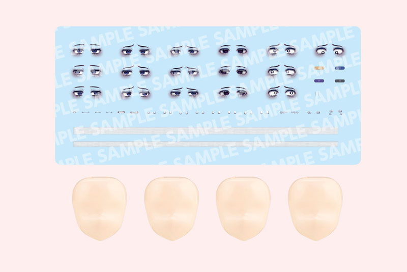 1/10 Explanation Facial expression parts design: Yunosuke Maruya Customized face & decal set Vol. 6 is a set of newly shaped custom unpainted facial expression parts C and newly designed facial decals. The concept of facial expression design is “sickness”. Mr. Amema’s specialty is his slightly, or rather, “sick” expression. In addition to eyes without highlights and a tearful expression, we have added highly versatile bonus elements such as bandages and plasters, so please feel free to create and play with your own “Sickly Kawaii” character. The included “unpainted facial expression parts C” no longer have the eyes and mouth shaped like the existing characters, and can be customized in various ways using facial decals. The molding color is fair-skinned Color C, and it can be used in combination with the separately sold “Dress Up Body