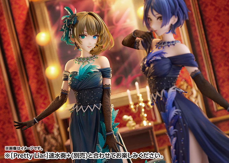 PVC (partially ABS) Explanation Prototype production: Mishima Production cooperation: Sasaka (Fukufuku), Sakura (Fukufuku) A new stage full of starlight begins – From “THE IDOLM@STER CINDERELLA GIRLS”, Kaede Takagaki appears as a 1/7 scale finished figure! She has been made into a figure wearing a noble and beautiful long dress, singing the unit song “Pretty Liar” as part of the unit “Mysterious Eyes” with Kanade Hayami. The dress has wide open shoulders and a slender silhouette. Her beautiful legs peek out through the slit of her flared long skirt, and the hands of her long lace gloves are attached to show off her classy charm. Clear parts are used abundantly for the bijou and feathers that decorate the dress, and the beautiful green that is the image color of maple shines. Please take a look at the beauty of her adult mask with her odd eyes and glossy lips, as well as the real woman hidden there. *The product does not stand on its own. Please use the included pedestal.