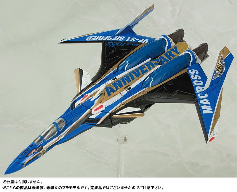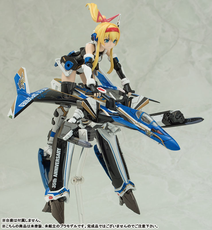 – 35th anniversary coloring designed by Hidetaka Tenjin and supervised by Masaharu Kawamori, based on the VF-31J – The blonde hair ponytail comes with a hair ribbon inspired by Macross Delta – The structure of the girl’s knee joints, as well as the hips and waist fittings have been revised to improve the range of movement – Face parts with different expressions and new hand parts are included – Coloring reproduction stickers and eye decals are included *Pedestal is not included. *This product is a plastic model kit. Separate tools are required for assembly.
