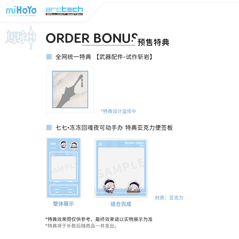 Figure body Replacement facial parts x 3 (including the main body) Replacement wrist parts x 9 (including the main body) Skirt parts for sitting x 1 Replacement costume parts x 1 set Replacement tag parts x 1 “Kabyou Onisari” effect parts x 1 Coconut milk x 1 Auxiliary support x 1 set Exclusive display pedestal x 1 set ≪Store common benefits≫ Weapon “Zangan Prototype” ≪Pre-order bonus≫ Acrylic memo stand Explanation Prototype production: Sami Prototype supervision: btxwb Coloring: Luu From the new generation open world RPG “Genshin”, “Shinana”, a medicine collector and disciple of the drugstore “Fuburo”, is now available as an ARCTECH movable series! As a 1/8 scale movable figure, there are 19 movable joints throughout the body, ensuring a wide range of motion without compromising proportions. In addition, you can enjoy three types of exchangeable expression parts, a wide variety of wrist parts and props, and a greater degree of freedom in how you play. In addition, the weapon “Zangan Prototype” is included as a common benefit for all stores! Please take this opportunity to get your hands on it! Overseas products tend to have a higher chance of being delayed or canceled than domestic products, and due to differences in import distribution routes, the arrival time of the product may differ from that of other stores. In addition, if the package is damaged when it arrives at our store, we will not be able to replace it with the manufacturer, so if you are concerned about the condition of the package, please refrain from ordering.