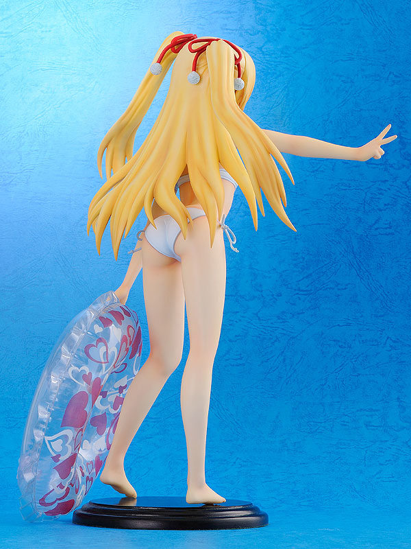 Total height: approx. 330mm ●Exclusive pedestal included Explanation Prototype production FREEing Anime “Listen to your dad! ”, the second daughter of the three Kotoriyu sisters, Miu Kotori, is now three-dimensionalized in a bold white bikini! Her blonde pigtails inherited from her mother, who is of Russian descent, are flowing, and she gives a peace sign and smiles energetically. The attached large heart-shaped floating ring can be held in the left hand. Please enjoy the big volume of 1/4 scale.