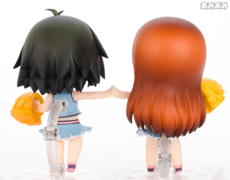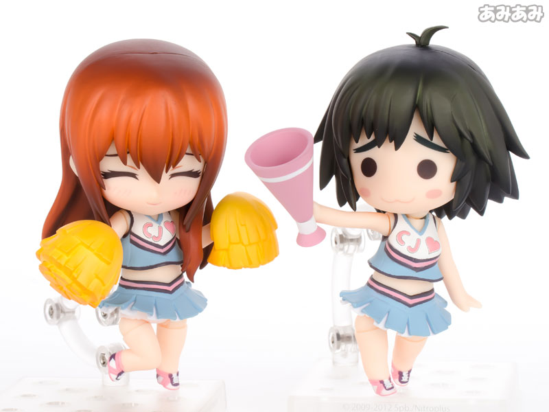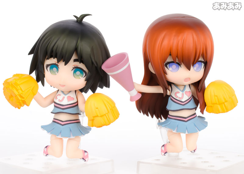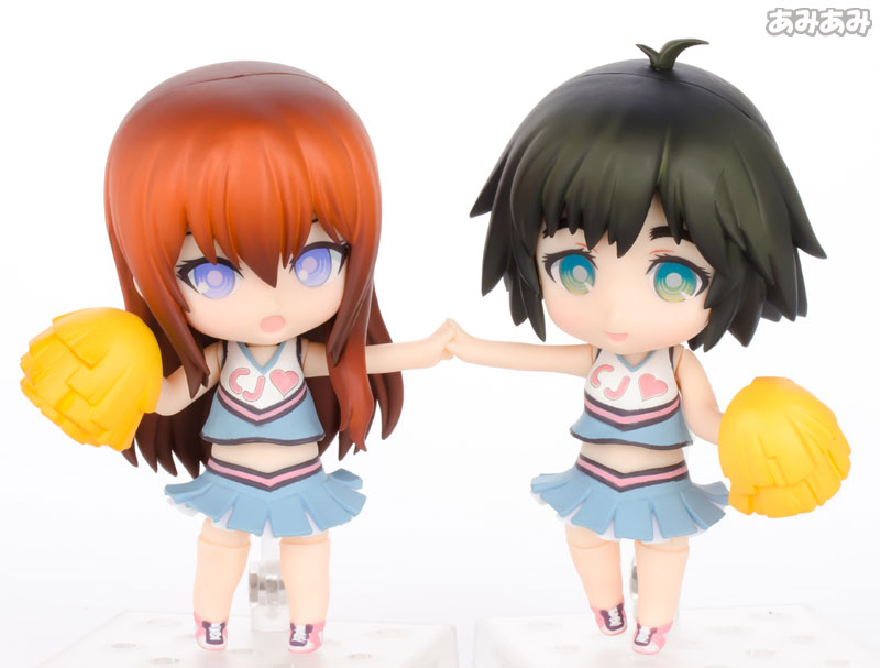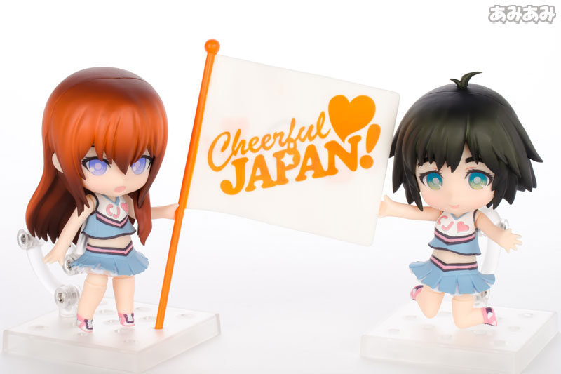 Total height: Approximately 100mm (non-scale) Description Two people with different characters unite and cheer with full energy! The fifth installment of the charity project “Cheerful JAPAN!” is a Nendoroid set of the two heroines “Kurisu Makise” and “Mayuri Shiina” from the hypothetical science adventure “Steins;Gate” dressed as cheerleaders! In addition to optional parts such as pompoms, a megaphone, and a cheering flag, Kurisu also comes with an “encouraging face” and “concerned face” that allow you to create a shy yet powerfully encouraging image. Mayuri comes with a “supporting face” and a “(´・ω・`) face” that allow you to show her warm support at her own pace. It is also possible for two people to pose together like cheerleaders, so please enjoy a variety of situations.