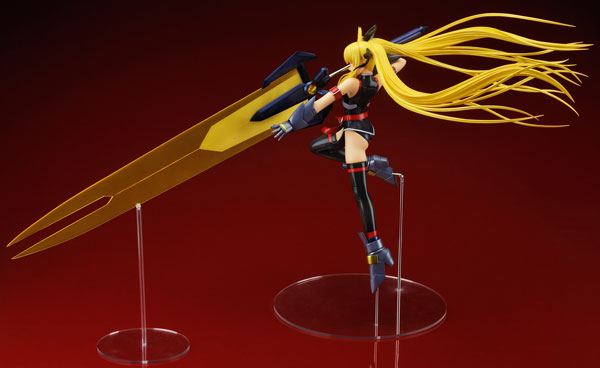 Figure body Dedicated base Riot Blade Riot Zamber Left wrist for Riot Zamber Explanation First release: November 2009 Prototype production: Hiroyuki Tsumezuka From the third installment of the popular anime series “Magical Girl Lyrical Nanoha StrikerS”, “Fate T. Harlaown” has been made into a three-dimensional figure in her true Sonic form. The large fluttering twin tails and two swords at the ready make use of a wide space and create a statement piece. “Riot Blade” can be replaced with “Riot Zamber”! Please enjoy the display according to your preference. ●Riot Blade Total length: approx. 270mm ●Riot Zamber Total length: approx. 560mm *Left wrist (open hand) for Riot Zamber is also included.