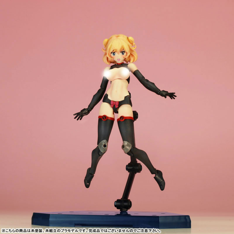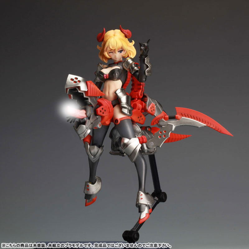 plastic model series brought to you by has finally arrived after many years of conceptual planning. This is a new plastic model based on the body “Machinica” by the rare prototype sculptor Maki Asai, which combines a body that pursues an unprecedented style with a beautiful girl character drawn by popular illustrator Saitom. The dragon gauntlet worn on his right arm is attached to the beautiful girl Sophia, and he sometimes serves her as a companion, and sometimes as if she were possessed. It is also possible to pose astride her back. Special parts for the dragon’s mouth and pre-painted chest parts, which are unique to the DX Ver., are also included, and together with the expression parts for R18 status, it invites you to a somewhat lewd space. The extendable wing-shaped blades attached to both legs give a sense of spaciousness, and the included blades that can be attached to the legs, arms, and even the spear allow for various arrangements. The standard version includes a straight face facing forward, a battle screaming face facing left, and a face with one eye closed, and three different facial expression parts are included, allowing you to enjoy a wider variety of play options. By replacing the included bun hair part with the red double horn parts, you can change from the dark devil appearance to a cute natural bun hair style. Please enjoy the worldview where the power of darkness descends (Advent) and its devilish charm.