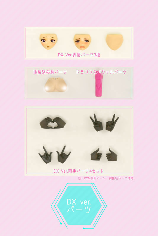 Hand parts x 9 (general version 5 types + DX version 4 types) Trident parts Blade parts x 2 Dragon gauntlet parts Pedestal set Bun hair parts Face parts (general version 3 types with expressions, DX version 3 types) Painted chest parts Dragon special parts Decal sheet x 1 POM joint