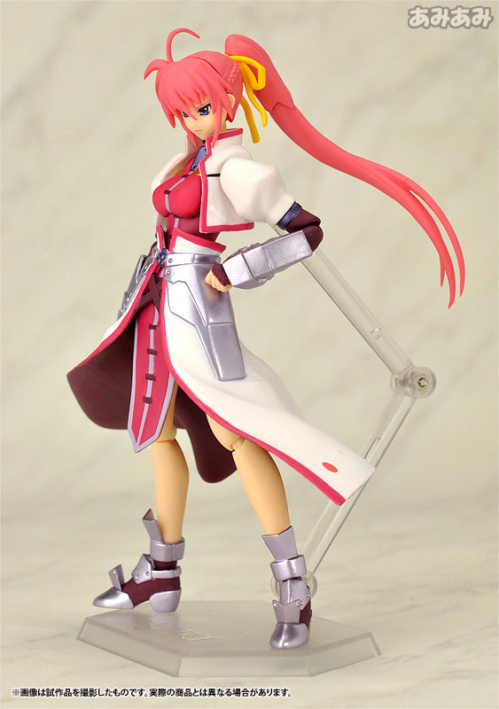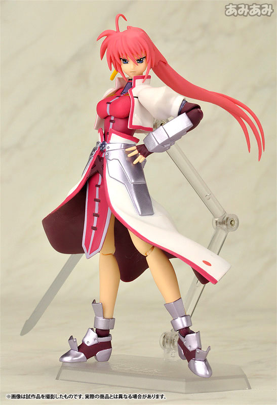 Figure body Dedicated pedestal Levantein (Schubert form) Levantein (Schlange form) Levantein (Bogen form) 2 types of expression parts Replacement wrist Arrow sheath Explanation First release: July 2009 TBD Prototype production: Max Factory, Maki Asai From “Magical Girl Lyrical Nanoha StrikerS” comes a figma of Hayate Yagami’s guardian knight, Wolkenritter’s general “Signum”! -Reproduce every scene from the movie with figma original joint parts that are smooth and precise. ●By using soft material for movable interference points, a wide range of motion is ensured without compromising proportions. -The armed device “Levantine” is available in three types: “Schubert form” which can reproduce the state of being enveloped in flames, “Schlange form” which can be freely moved using wires, and “Bogen form” which is in a bow state. ●The two types of facial expression parts are both dignified and typical of Signum. -An angled handle and hands to support the “arrow” and “sheath” are also included, allowing for more knight-like poses. -A figma-specific pedestal with a movable support that enables various scenes is included.