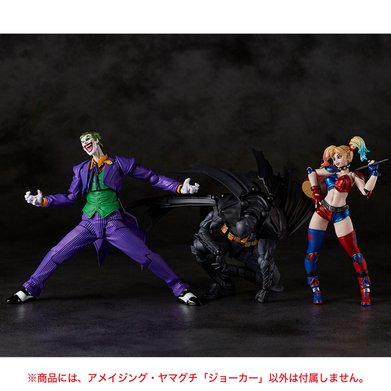 Figure body Machine gun x 2 Toy gun (A) x 2 Toy gun (B) *Flag included Optional face x 1 *Mouth open Optional hand x 6 Cane Bullet effect parts x 2 Denture bomb x 1 Attachment parts Laughter effect parts x 2 General-purpose base Eye movable pick Explanation Prototype production: Katsuhisa Yamaguchi ●Batman’s biggest and deadliest nemesis “Joker” appears! ●The “Clown Prince of Crime” finally appears in the Amazing Yamaguchi ●The most insanely mobile “Joker” appears.・The fifth DC character, the Joker, who boasts an unshakable position as a villain in the American comic world, has finally appeared. ・His relationship with Batman, which has been explored in numerous masterpiece comics, is not just a matter of good and evil, but a deep karma, and he is truly a mortal enemy! A bold movable arrangement is added to the tailcoat style with flashy colors, making it three-dimensional with an unexpected range of motion. ・The unique articulation based on Katsuhisa Yamaguchi’s prototype allows for a wide range of poses, such as spreading out his arms to show off his presence and cradling his own body as if in agony. The tail of the tailcoat can also be flipped up with a movable joint to create an action scene. ・The contrast between her white skin and green hair is vivid, and her face is engraved with a smile that never fades, with deep wrinkles and ink marks for a realistic finish! -In addition to firearms, the included items include a toy gun, wind-up dentures, and other stylish items. Furthermore, the overflowing madness is expressed with two hilarious onomatopoeia sheets of “HAHAHAHAHAHAHA!” – Great compatibility with Harley Quinn and Batman from the same series! Enjoy the most ferocious action figure full of madness in everything from its facial expressions and poses to the included items, causing fear and chaos throughout the city.