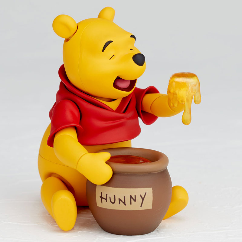 Figure body Optional faces x 4 (smile, sleepy face, grimace, proud face) Honey parts x 1 Stump chair x 1 Wooden stick parts x 1 Muffler parts x 1 Optional hands x 6 Explanation Prototype production: Eiichiro Matsumoto The laid-back and gluttonous Winnie the Pooh has been made into a movable figure with a calm atmosphere! ■Winnie the Pooh, the main character from the animated movie “Winnie the Pooh,” is now available as a movable figure. The cute round form of Zunguri has been made into a three-dimensional figure just like the image from the movie. We have recreated all the features of a stuffed animal that are soothing to look at and make you want to touch them. ■We place emphasis on the atmosphere of Winnie the Pooh that the stuffed animal is moving, and the joints of each part are arranged in a discreet manner so as not to lose its shape. By making full use of the clever joint structure, which includes a ball joint in the chest and a movable axis in the abdomen, it is possible to recreate both the posture of a baby standing with its belly bulging out and its buttocks sticking out, as well as the slightly unbalanced and cute sitting posture. ■Revolver joints are placed at the arms, hip joints, ankles, neck, and base of the ears. You can add facial expressions that show emotions by tilting your head slightly and moving your ears, and even with minimal movable parts, you can pose him with many of the adorable movements he showed in the movie. ■One of Pooh’s great charms is that he shows his honest emotions. With this item, you can recreate famous scenes from the movie by replacing facial parts. In addition to Pooh’s usual expression with one eyebrow slightly raised, he comes with 5 different expressions: a satisfied smile after eating a lot of honey, a groggy and sleepy face, a grimacing expression when he runs out of his favorite honey, and a proud expression. ■Pooh’s favorite food is honey. Also included is a jar of honey that you always have on hand! It comes with a dripping honey effect part, which can be attached to the rim of a pot or held in Pooh’s hand to create a picture of him eating honey deliciously. It is also possible to remove the head part and attach the pot. honeyYou can also recreate the comical appearance of him sticking his head into a pot and not being able to get it out. ■Optional parts include a muffler to wear in the winter, a chair with a stump design that you can sit on, and a tree branch. By holding the tree branch in your hand, you can recreate situations such as chasing a bee or making a bonfire in the movie. ■You can also recreate situations where only the butt sticks out when stuck in a hole in a tree or the entrance to Rabbit’s house. Pooh’s body from the waist down can be removed. The lower body part has a built-in magnet, so by attaching it to a refrigerator or metal wall, you can recreate a situation where it gets stuck in a hole in a tree or the entrance to Rabbit’s house, with only its butt sticking out. If an obi is included in the package, the obi is outside the scope of the product specifications. Damage to only the obi will not be eligible for replacement. Please be aware of this before purchasing.