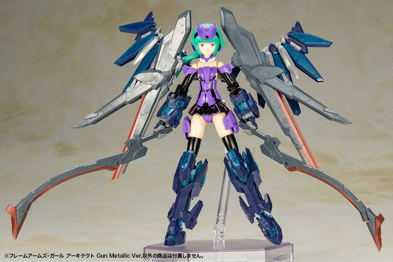 Overall height: Approx. 150mm (NON scale) Explanation Prototype production: Yasutoshi Shimizu Kotobukiya The latest work of the spin-off series “Frame Arms Girl” of the original robot content “Frame Arms” is “Architect Gun Metallic Ver.”! The Frame Arms “Architect” designed by Noriyuki Yanase has been made into a three-dimensional figure based on the beautiful girl illustration by Fumikane Shimada! This time, it will be a product in a different color of “Architect”.