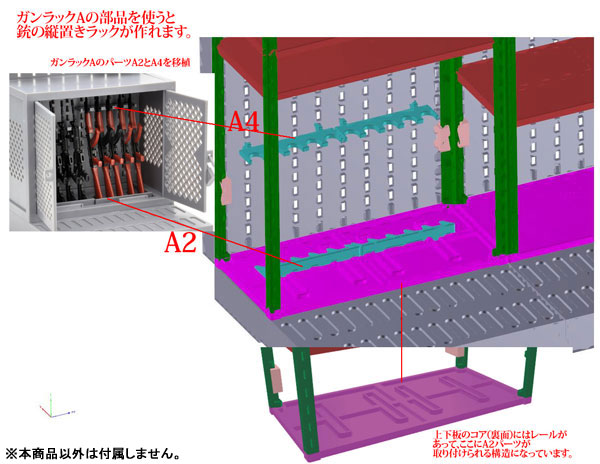 Floor base Wall x 2 Hook x 10 Joint parts x 5 Wall-floor connection parts Support x 4 Top plate bottom plate Middle plate x 2 Rack fixing parts x 4 Explanation Steel racks are used in everyday life, and are also used in the military as shelves for storing weapons. This work has a structure with steel shelves added to the walls and floor. It is a convenient item for displaying firearms and accessories with two legs. A gun hook for the wall and a paper craft carton are also included. You can also use the connection joints to expand your existing gun rack. Can be connected to various Little Armory series gun racks and shooting ranges (each sold separately). Please use it for collection display and combination photography. The box art is an illustration by Hankonohito! ! *Using adhesive for plastic models is recommended. *Firearms, ammunition, figures, etc. are not included with the product.