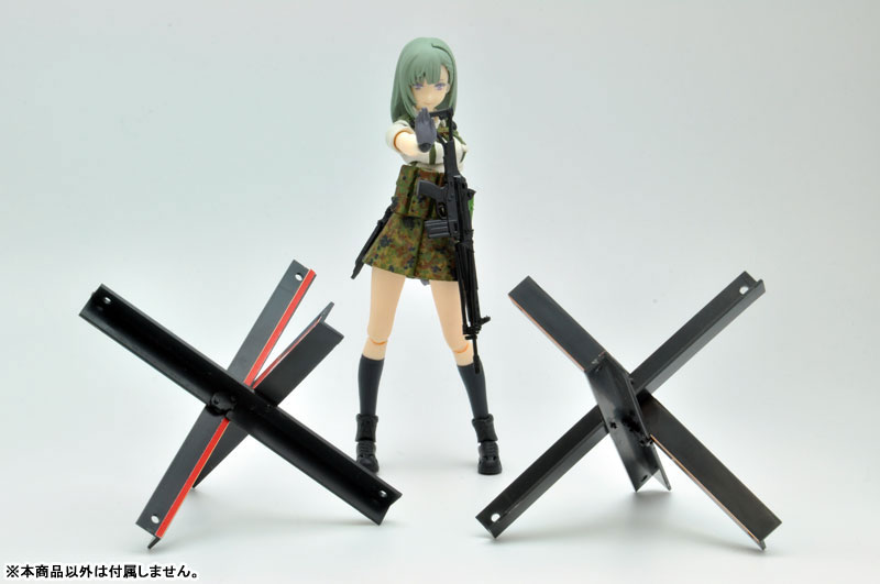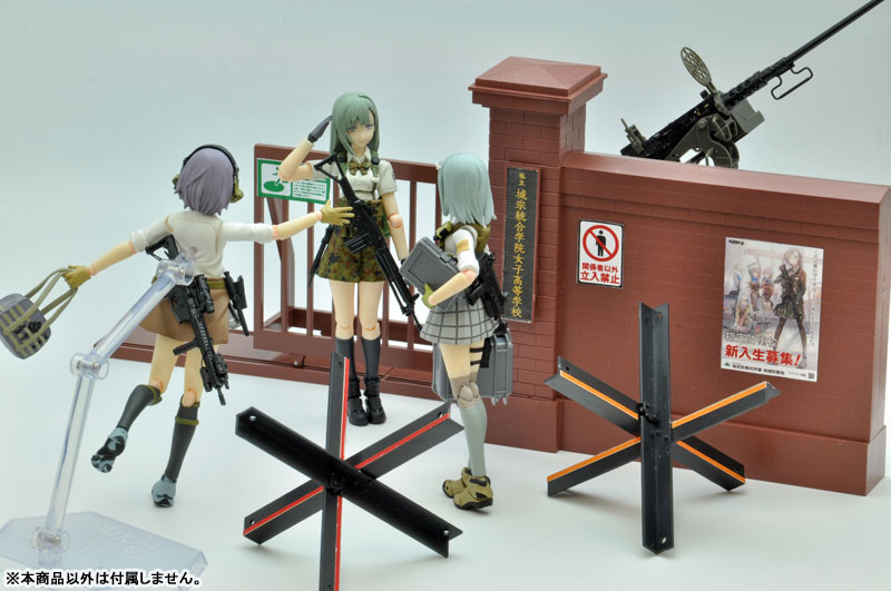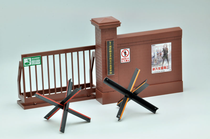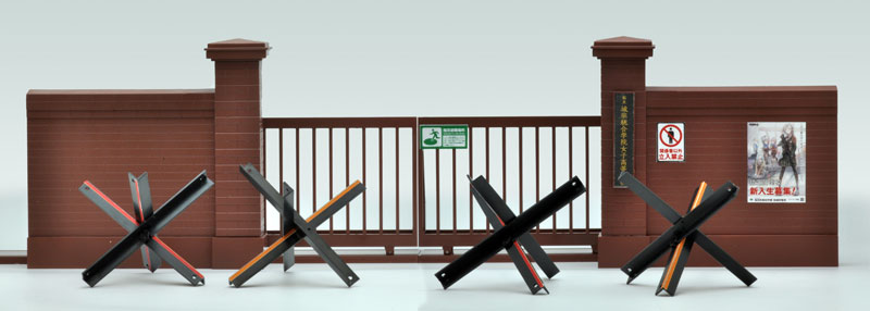 Wall + gate x 1 Rail x 2 Plate x 1 (brown resin) Barricade x 2 sets (black resin) Explanation Package art: Mr. Fredy Sakazaki This is a scenery kit for 1/12 scale movable figures based on the image of the school gate of a designated defense school attended by armed girls. Reproduces the “rail-sliding sliding door” constructed by combining traditional brick walls and iron gates found in schools, public facilities, military bases, companies, etc. Also, a barricade has been added as a new mold part. This is an active vehicle-blocking barricade that is a scaled-down version of the anti-tank obstacle from World II, famous as the “Czech Needle Rat,” to increase its versatility. â– Decoration stickers included (Paper size: 190 x 180mm) We have prepared versatile decoration stickers for recreating schools, public facilities, bases, etc., from school name plate stickers to posters and signs.