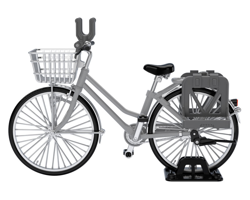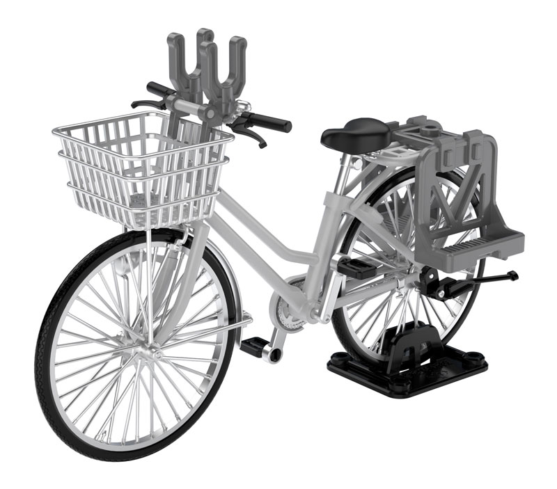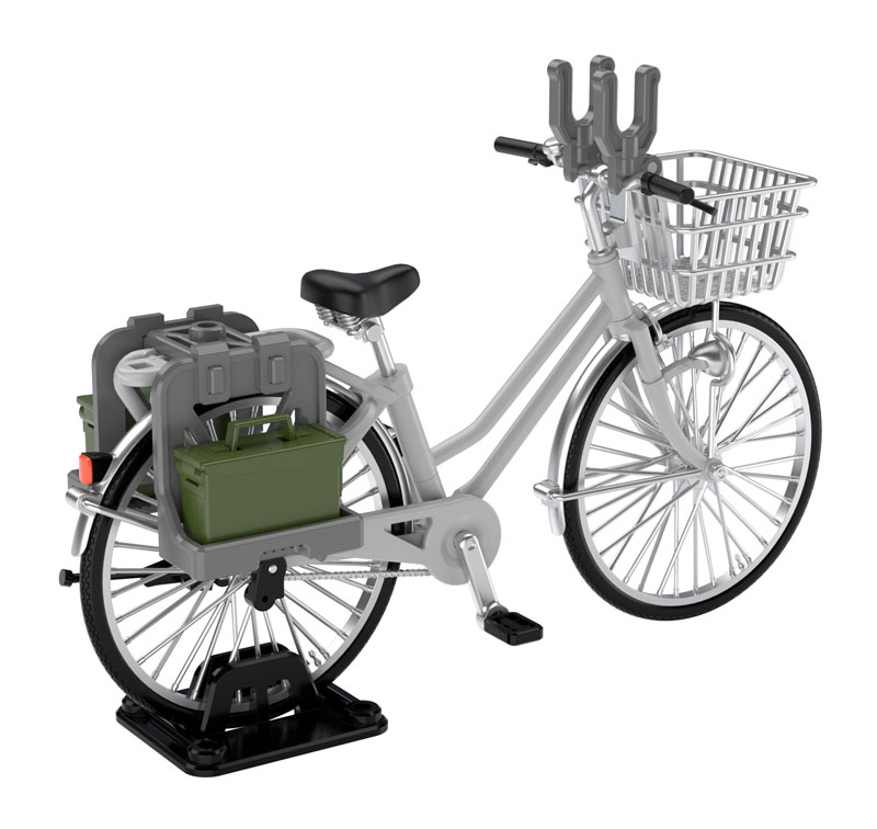 Body: ABS, tires: TPR Description ■Crank pedal, tire rotation ■Handlebar, stand movable ■Seat post length and short ■Rack etc. can be attached and removed ■Display stand included ■1/12 scale that also fits movable figures A 1/12 bicycle model produced by the 1/12 scale military series “Little Armory” that is fun to combine with movable figures! We will commercialize an “ordinary bicycle” based on the concept of a school bicycle for armed high school kids. 一般的なシティサイクルでみられる、前かごや荷台、ヘッドライト、リング式の鍵など、細部をしっかりと再現。 It is also commonly equipped with a handle-mounted gun rack suitable for designated defense schools. In addition, accessories for military use such as rear carrier-mounted racks and hard shell boxes, which differ for each color, are included. Of course, if you remove the accessories, it instantly transforms into a normal commuter/school bike!