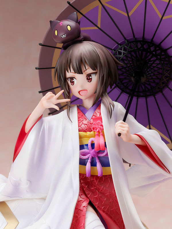 PVC, ABS, iron, magnet Explanation Prototype production: Moineau Color production: Aizer ◇ “My name is Megumin! I’m with you wherever I go, whether it’s the toilet or not!” “Movie KonoSuba: God’s blessing on this wonderful world!” From “Crimson Legend” comes a scale figure of “Megumin,” the best magic user of the Crimson Demons, in a beautiful white figure! The white solid wood expresses delicate patterns through modeling, and the color scheme of the uchikake and kakeshita is infused with Megumin’s style everywhere. A Japanese umbrella inspired by Megumin’s hat is also included. The familiar “Chomusuke” that sits on his head is also a highlight. The smile that makes you smile while doing the usual Chuunibyou pose is just as cute as an explosion! Please have “Megumin” full of happiness and a lovely smile in your possession. ◇“Chomusuke” is also included! Her carefree smile is a surprise! So cute! The delicate hair flow is also carefully expressed. With a slight blush on her cheeks and an innocent smile as she poses in a customary pose, your heart will surely be blown away. The familiar “Chomusuke” on her head also attracts Megumin’s cuteness. ◇Delicate patterns on the surface of the fabric are expressed through modeling The patterns on the fabric are expressed through modeling rather than painting or decals. The pure white uchikake is decorated with pale pearl paint and gradation paint, and is accented with gold lines inspired by Megumin’s costume. The color scheme of the kakeshita is also in pursuit of Megumin’s uniqueness, and the color scheme of the uchikake, kakeshita, and Japanese umbrella harmonize perfectly. Don’t forget Megumin’s trademark bandage on her slim legs that peek out from the solid white dress! ◇A Japanese umbrella inspired by Megumin’s hat is also included The Japanese umbrella held in her hand has a color scheme and decoration inspired by Megumin’s hat. ◇Adorable from any angle An innocent smile, a Chuunibyou-like gesture, and a beautiful white solid wood fluttering in the wind… We have created a figure that is beautiful and cute from any angle. ◇”I think we’ll have no choice but to sign a long-term contract.” Please invite “Megumin”, who is full of happiness in a pure white dress, to your hand.