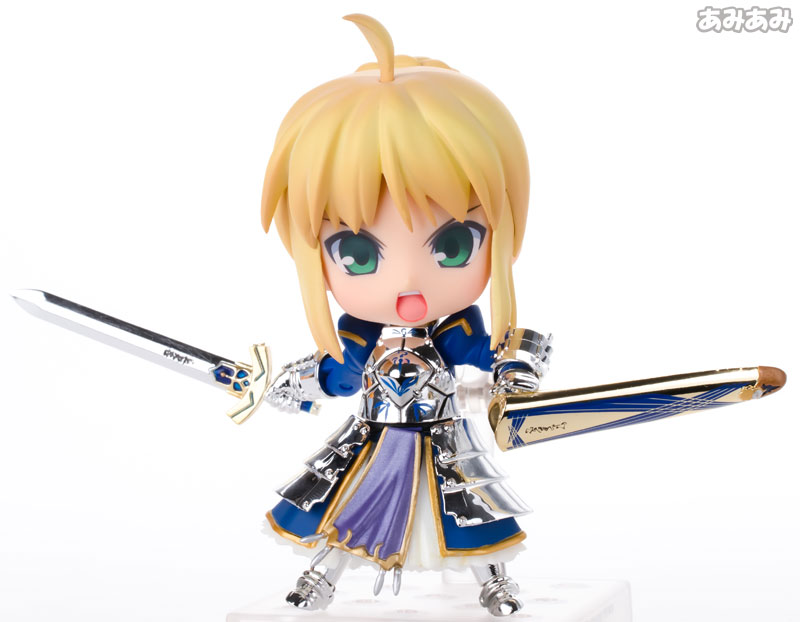 Figure body Dedicated pedestal Smiling face Angry face Depressed face Excalibur Caliburn Invisible sword in air state Description “Nendoroid Saber” released as a deluxe version with full body movement “Super Movable Edition” is now available with a new plated appearance to commemorate TYPE-MOON’s 10th anniversary! In addition to three types of facial parts: a smiling face, an angry face, and a depressed face, a wide variety of optional parts are available, including Excalibur, Caliburn, and even a sword in an invisible air state. Recreate various scenes from the movie with the “Super Movable Edition” which expands the range of play while maintaining the cuteness of the Nendoroid!