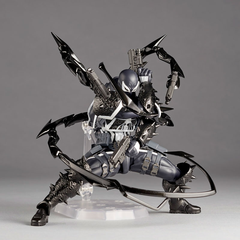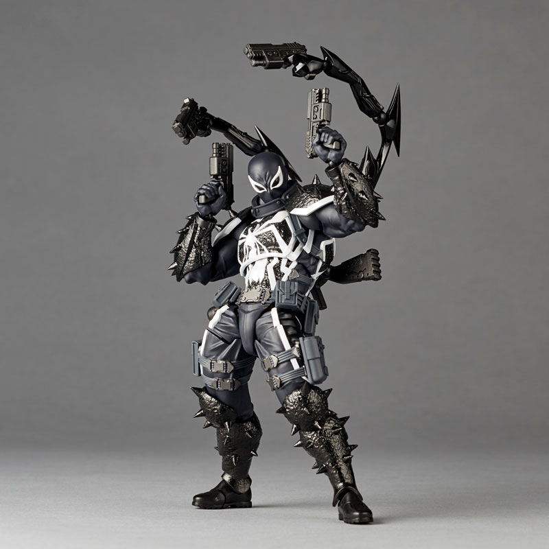 Figure body Optional eyes x 6 Optional hands x 8 Handgun grip and holster set x 4 Ammunition pouch x 4 Vulcan bazooka x 1 Handgun x 4 Symbiote tentacle parts x 16 Muzzle flash effect x 4 Symbiote weapon x 1 Web x 2 Display stand x 1 Explanation Prototype production: Katsuhisa Yamaguchi From the world of “Spider-Man”, a new hero who inherited the Venom symbiote (parasite) appears in Amazing Yamaguchi! Flash Thompson is Peter Parker’s high school classmate and former bully who became his best friend. Although he lost both legs while serving in the military, he was recognized for his ability to bond with symbiotes and for his heroic actions on the battlefield, and was given a new life as the hero Agent Venom under government control. The protector and symbiote are integrated, and the transformed figure where the lost leg is replaced by the symbiote is made into a three-dimensional figure based on the image of the comic. The aggressive silhouette created by the protector is lined with sharp thorns, and the details on the surface covered by the symbiote are also carefully crafted throughout the body. The strong physique that has been active as an American football player since his student days is fully equipped with unique movable gimmicks by Katsuhisa Yamaguchi, and he acts with a sharp body line that looks like it jumped out of a comic! Furthermore, while controlling the symbiote, he also uses firearms that he is skilled at handling due to his military experience, expressing his unique battle style with recombinable tentacle parts and a large number of firearms! In addition to the webs he fires from his hands like Spider-Man, the tentacles that extend from his body can be rearranged with five different parts, allowing you to freely enjoy fighting styles such as a 4-gun pistol controlled by the tentacles extending from his back. ●The goggle part of the silver rim can be replaced. In addition to the normal expression, you can use a total of 4 different expressions including one with sharply squinted eyes, one with wide eyes, and one with glowing green eyes. -Like a military agent, it comes with plenty of holsters and ammunition pouches that can hold 4 handguns. You can freely attach it to your waist belt or thigh. A muzzle flash effect can also be attached to the tip of the gun, increasing the power of the shooting action!
