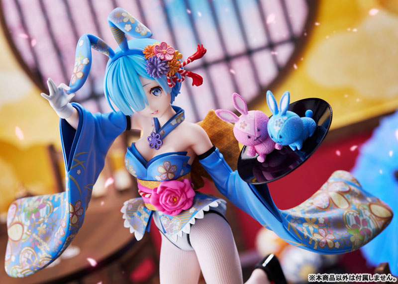PVC, ABS Explanation Prototype production: Yamachi, Yumo (Moineau) Color production: Itzuru Akechi (Taishodo) ◇The cute demon “Rem” in Japanese x bunny costume is now available on 1/7 scale! “Rem” from “Re: Life in a Different World from Zero” is now a 1/7 scale figure wearing a Japanese bunny costume! Wearing a sky blue Japanese bunny costume, her bunny ears and tail are super cute! The hair ornaments, the moving long-sleeved kimono, the realistic tights made of cloth, and the clogs are all carefully crafted. Get your hands on the adorable “Rem” in a Japanese bunny costume. *Japanese bunny is a registered trademark of Furyu Co., Ltd. ◇Extremely cute Japanese-patterned rabbit ears that hang down.Rem is a cute girl who tilts her head slightly and looks up at you. The Japanese-patterned floppy rabbit ears and the hair ornament are bright and beautiful! ◇Kimono is F:NEX original design! The texture of each part is differentiated, such as the beautiful shimmering long-sleeved kimono colored in sky blue, the shiny white leotard, and the gloves. Tights are made of real cloth! The big flower knot on the back of the kimono is also a highlight. The two rabbits on the tray represent the crepe material. ◇Pedestal inspired by lacquer It blends perfectly with the Japanese bunny costume “Rem”! ◇A demon is cute no matter where you look from! Please enjoy the contrast between the shimmering long-sleeved kimono and the shiny bunny costume, the sky blue Japanese bunny costume, and “Rem” looking up at you from 360 degrees, from any angle. ◇ Get a cute and demonic “Rem” in a Japanese bunny costume.