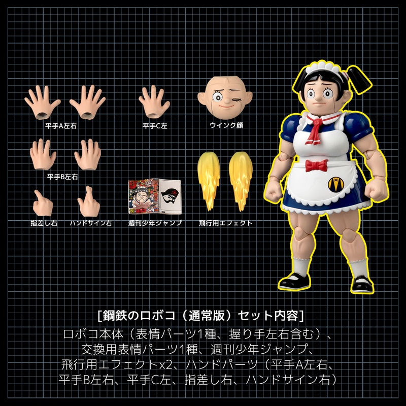 Figure body (1 type of expression part, including left and right hand grips) 1 type of replacement expression part Weekly Shonen Jump flight effects x 2 Hand parts (Smack A left and right, Smack B left and right, Smack C left, Pointing right, Hand sign right) Explanation Prototype: Shintaro Takahashi (ToToY LLC) x Wataru Orita Design: POLY-TOYS Movable Cooperation: NAKA-MOVE Finisher: Chip Painter: chipu From “Boku to Roboko”, the strongest maid robot “Roboko” in history is now available as an alloy toy! Luxurious product specifications suitable for “Roboco of Steel” using die-casting for the knees and shoulders. You can recreate scenes from the play using facial expression parts and optional parts! Enjoy your own Roboco world.