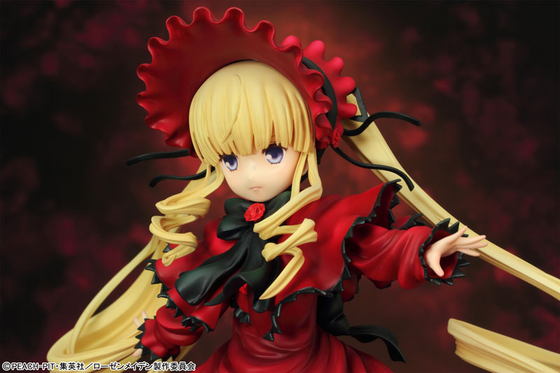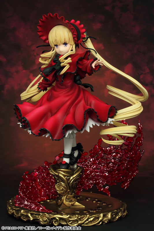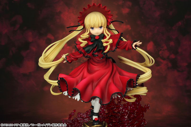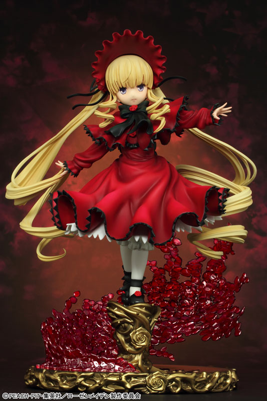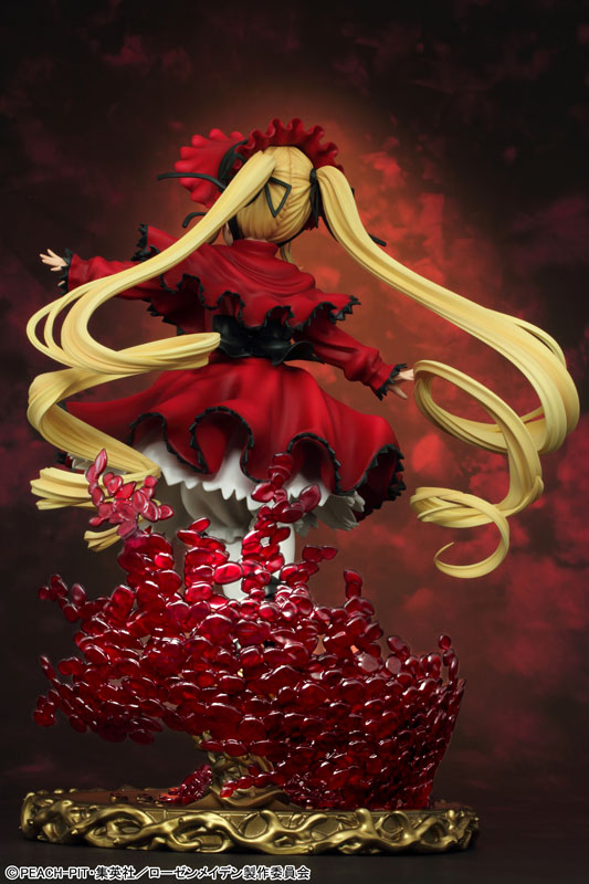 Total height: Approx. 16 cm (figure body) / Approx. 25 cm (including pedestal) Explanation Prototype production: TEAM GENESIS We will release the proud 5th doll “Shinku” from “Rozen Maiden”. She has been sculpted into a three-dimensional figure wearing a bright red dress with her arms outstretched and releasing a rose tail. Her powerful blue eyes and firm expression are full of elegance and pride. Her extremely long twin tails, which are as long as her body and draw a large spiral curve, are delicately and precisely reproduced. The cape coat and skirt flutter in the wind and have an attractive shape with flowing curves. In addition, the special pedestal, decorated with golden thorns and beautifully dancing rose petals, is made of clear material and is luxurious! Please welcome Shinku, the calm and collected leader of the sisters, to your side.