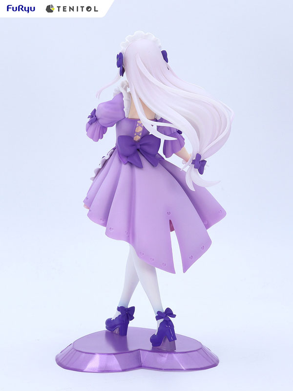 ATBC-PVC, ABS Description Prototype production: Sparrow Co., Ltd. From Furyu’s affordable figure brand “TENITOL” comes Emilia dressed in a dreamy color maid outfit. The pastel purple mini-length maid uniform has a fluffy skirt and plenty of ribbons, creating a dreamy and cute world. This design has a common theme with the previously announced Rem and Ram. The heart pattern on the hem of the skirt is cute, and clear parts are used for the hair to give it a translucent appearance. Please be sure to have the dream-colored cute Emilia at hand. Please enjoy it side by side with Rem, Ram, and Echidna. *“TENITOL Yumekawa Maid Rem”, “TENITOL Yumekawa Maid Ram”, and “TENITOL Yumekawa Maid Echidna” are sold separately.