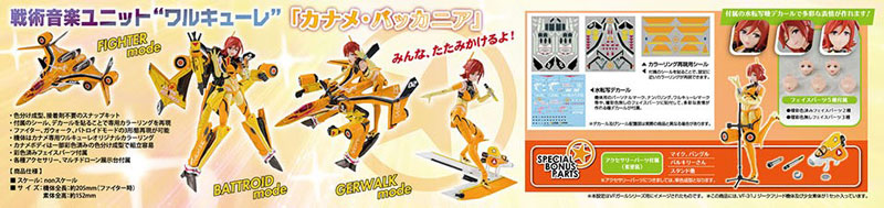 ・Color-coded molding, snap kit that does not require adhesive ・Special coloring can be reproduced by pasting the included stickers and decals ・Three forms of fighter, Gerwalk, and Battroid modes can be reproduced ・The aircraft has Kaname’s original Valkyrie coloring ・Kaname’s body is easy to assemble with color-coded molding that has been partially colored ・Pre-painted face parts are included ・Various accessories and a multi-drone display stand are included