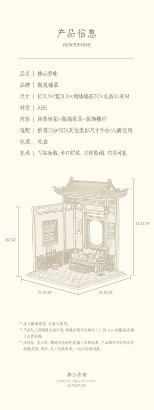 Background Mini furniture Props Explanation We are pleased to present to you the original 1/12 scale Chinese-style dollhouse “Fu Yun Xiangxie” planned and produced by the Chinese miniature manufacturer ZHENMU! Featuring elegantly curved roof decorations, elaborate openwork windows, and plenty of meticulously detailed furniture, it looks as if it was carved out of a corner of traditional Chinese architecture. Don’t miss out on this gem. Overseas products tend to have a higher chance of being delayed or canceled than domestic products, and due to differences in import distribution routes, the arrival time of the product may differ from that of other stores. In addition, if the package is damaged when it arrives at our store, we will not be able to replace it with the manufacturer, so if you are concerned about the condition of the package, please refrain from ordering.